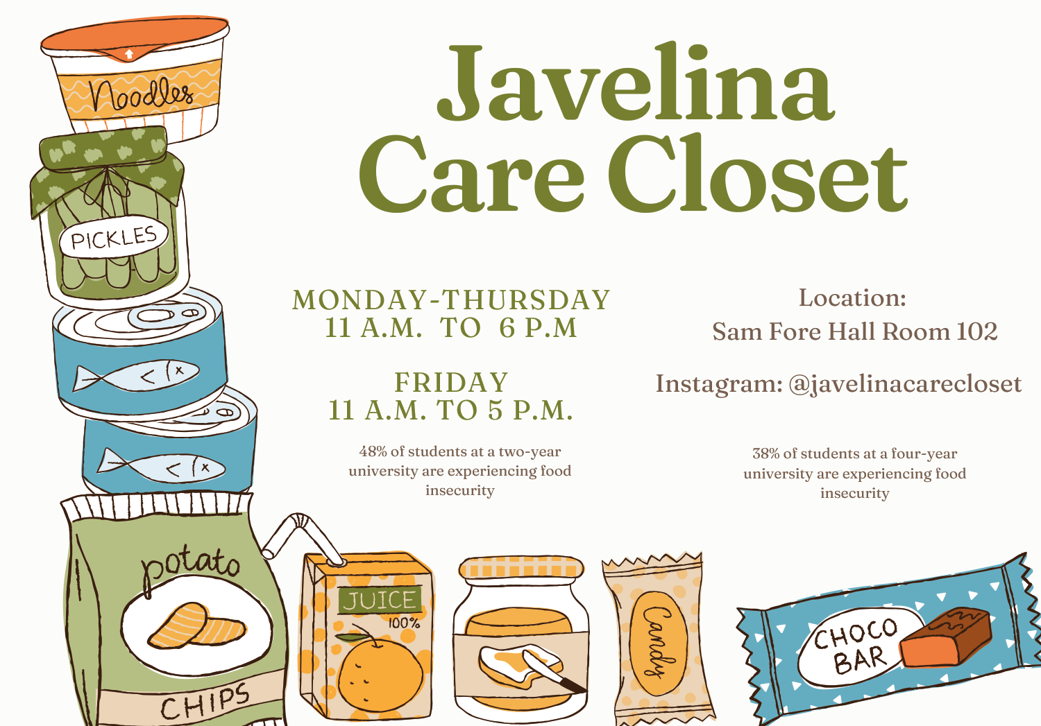 Food insecurity is the condition of not having access to a sufficient amount or adequate quality of food that is necessary to meet the needs of a person. With hopes to raise awareness regarding food insecurity on campus, the Javelina Care Closet provides food for every student who faces the lack of resources.